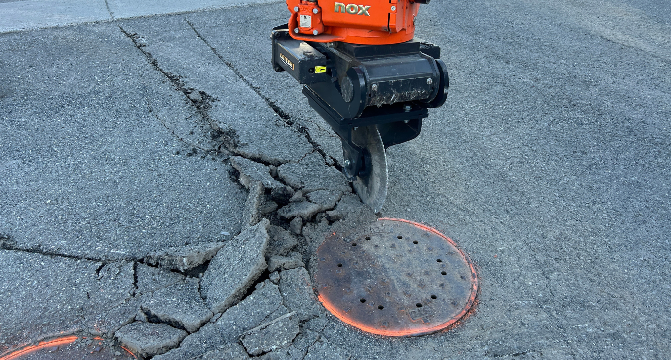 Made entirely of Hardox®, this robust tool resists abrasion and dense materials. Enables the operator to cut asphalt and other road surfaces with precision, even near buildings, curbs, sidewalks, and manholes.It allows the operator to expose only a precise section for repair. The asphalt cutter enhances jobsite safety by reducing the need for ground personnel while protecting surrounding obstacles.