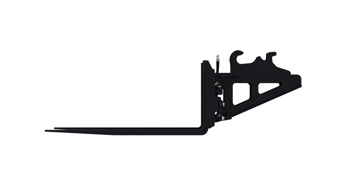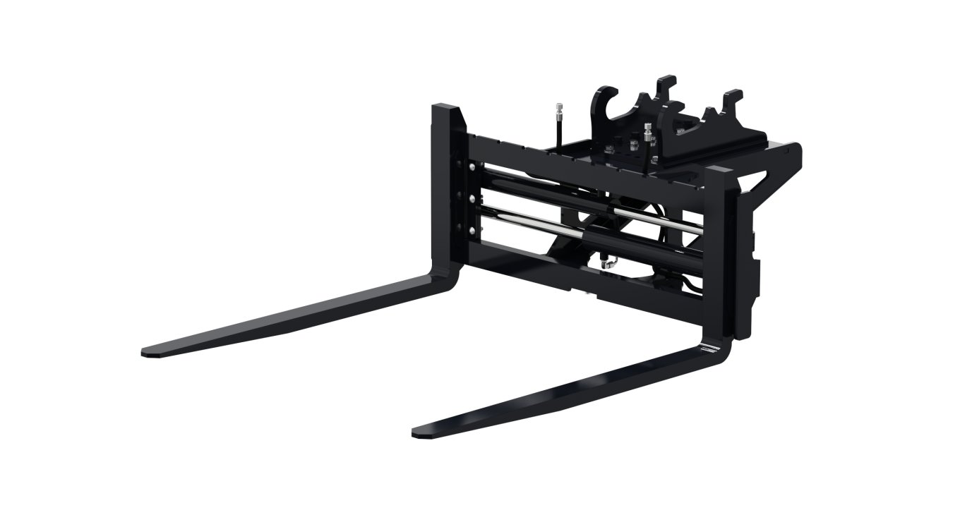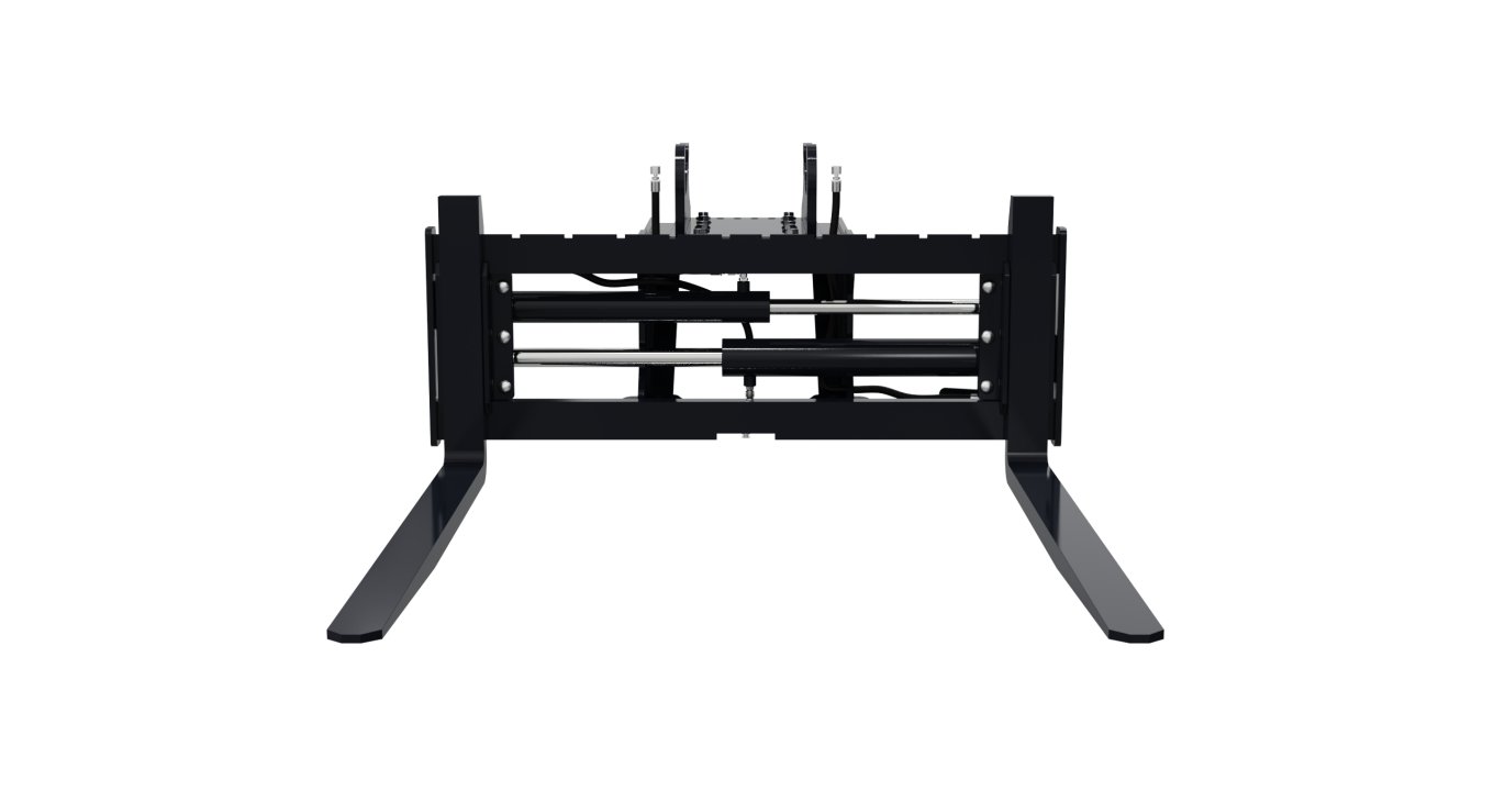 4,000 lb pallet forks with hydraulic adjustable spacing, increasing versatility by eliminating the need to leave the cab