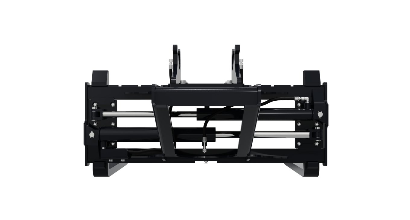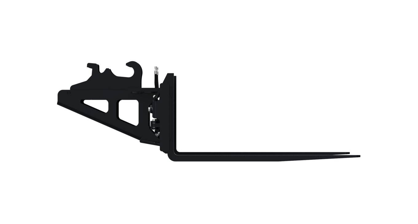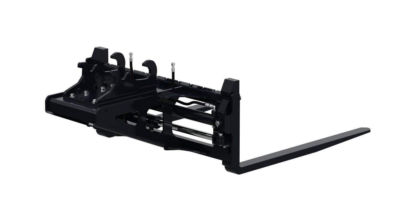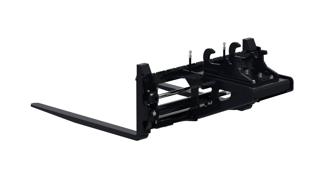4,000 lb pallet forks with hydraulic adjustable spacing, increasing versatility by eliminating the need to leave the cab